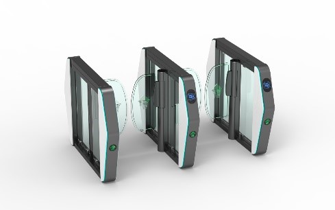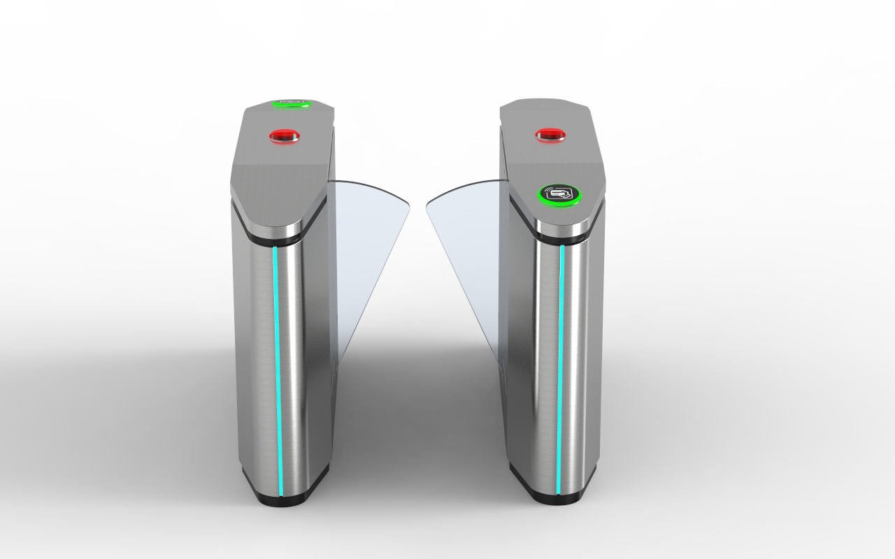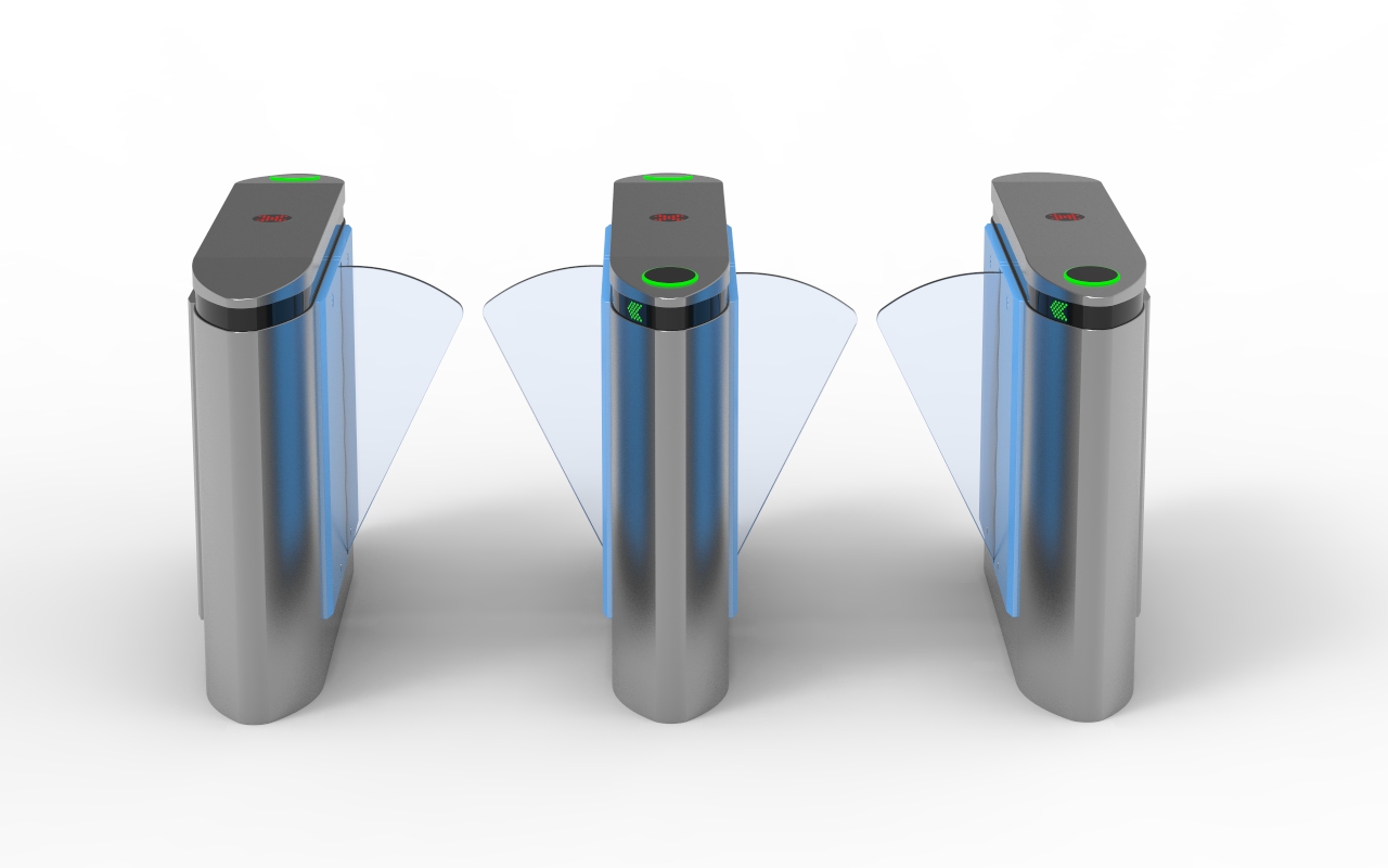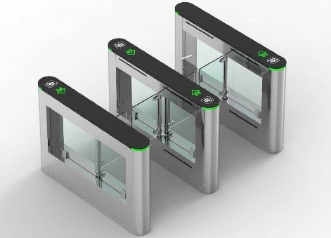 بوابة تحكم بألواح زجاجية متحركة (Flap Barrier Turnstile)، وتُعد من أحدث حلول التحكم في مرور الأفراد ذات الطابع العصري والأمان العالي.