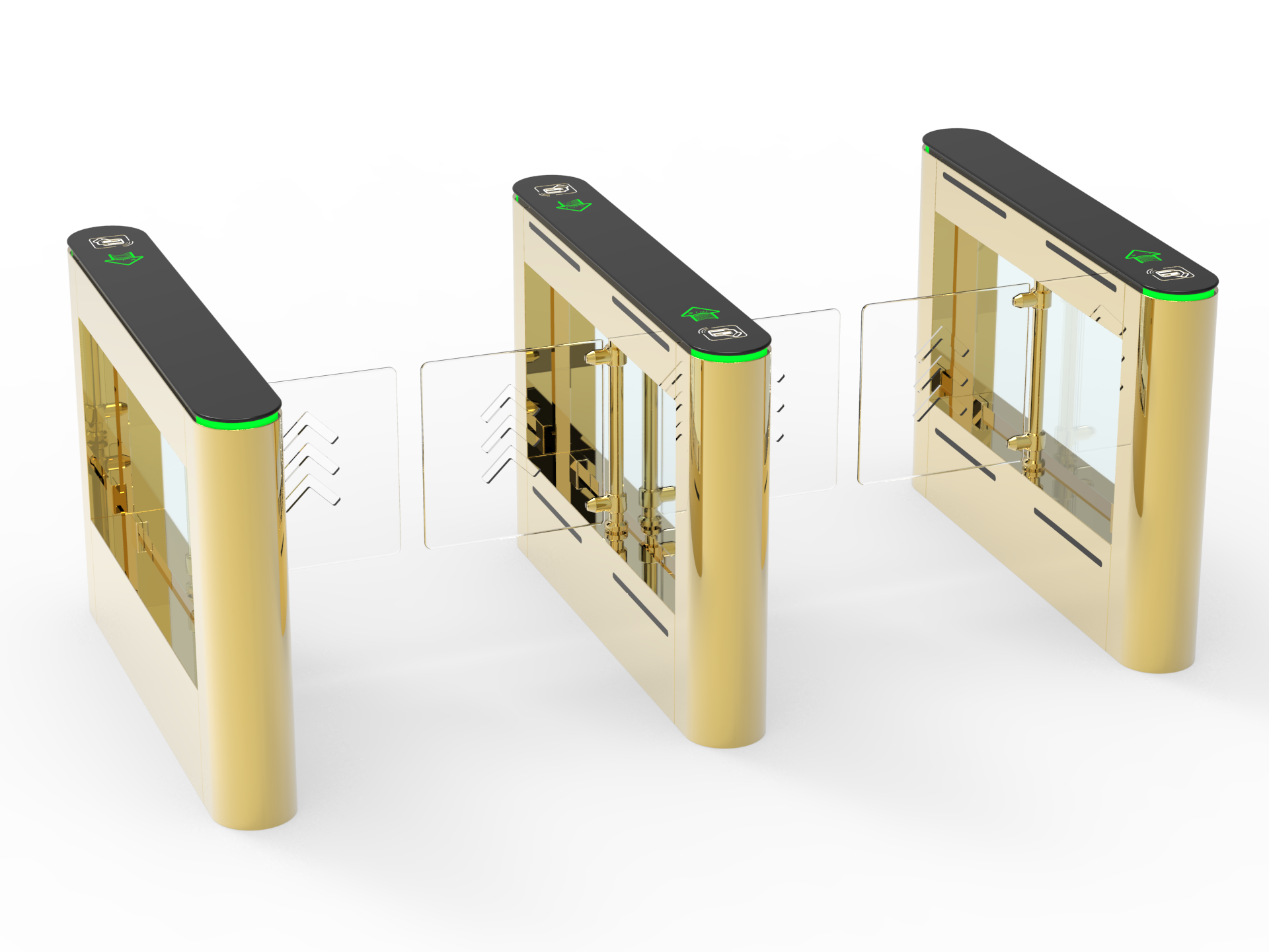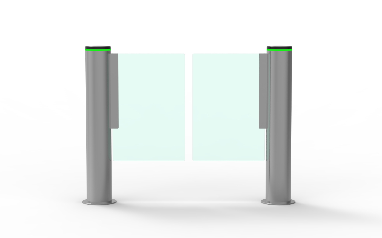 - آلية العمل: تعتمد على ألواح زجاجية مفصلية (Swing) تفتح وتغلق بسلاسة عند التحقق من صلاحية الدخول، مما يسمح بمرور شخص واحد أو أكثر حسب الإعدادات، مع حركة هادئة وآمنة.